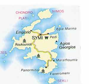liegt nahe an der kleinasiatischen Küste, nur etwa 21 Seemeilen südwestlich von Rhodos. Die Größe beträgt 58 qkm und der Umfang 85 km. In Symi kann man jeden Tag an einem anderen Strand baden, wobei man allerdings ein Boot braucht. Der Hauptort der Insel heißt "Ano Simi", von den Einheimischen auch "Chorio" genannt. Emborios, ein kleiner Ha-fen westlich von Ano Simi wird nur von wenigen Menschen bewohnt. Das wichtigste Kloster der Insel trägt den Namen "Panormitis". Es liegt an der Südspitze in einer geschlossenen Bucht mit Sandstrand. Das Kloster ist dem Erzengel Michael geweiht und wurde Ende des 18. Jh. erweitert Um die Insel so richtig kennenzulernen, ist die Besorgung eines kleinen Motorbootes sinnvoll. Wir besuchten zuerst die kleine Felseninsel "Ajia Maria" an der Ostküste in der Nähe von Jalos. Den wohl eindruckvollsten Strand (Ajios Georgios Disalonas) mit seinem 300 m senkrecht aufragen- den Felsen, muß man erlebt haben. Nanu, eine kleine malerische Bucht mit wilden Zypressen und einer kleinen Taverne befindet sich ebenfalls an der Ostküste. Einer der schönsten Strände nennt sich "Ajios Vasilios" an einer großen und weiten Bucht, umgeben von Bergen und Zypressen. |